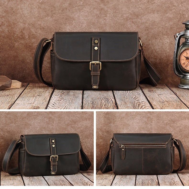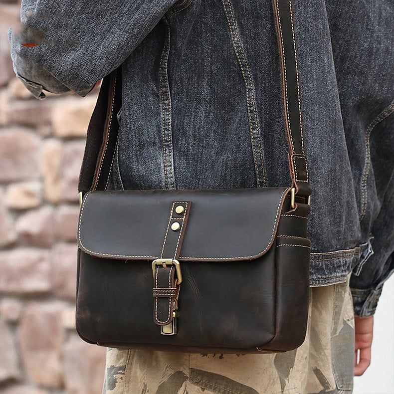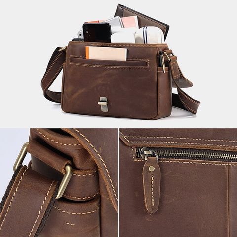 Mẫu túi đeo chéo nhỏ gọn, chất liệu da bò sáp bền bỉ, chắc chắn và cá tính