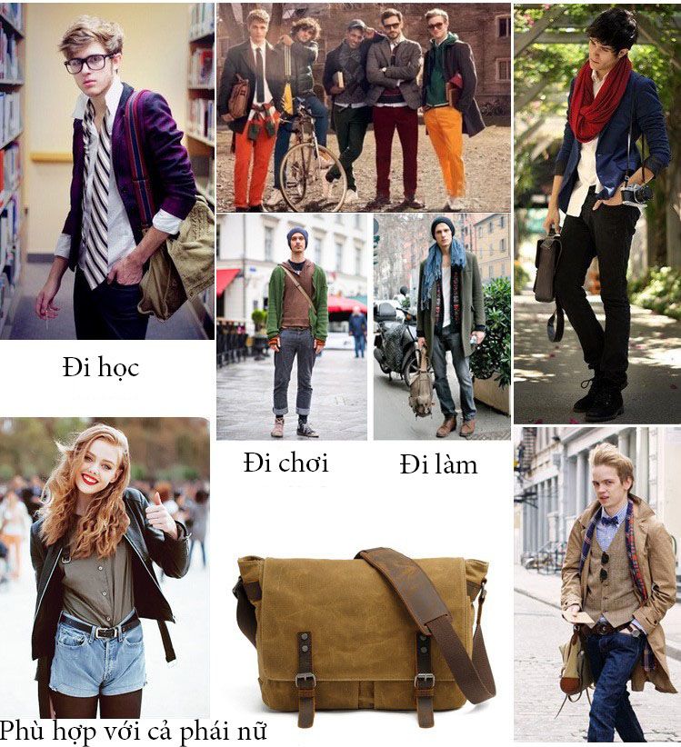 Cặp - Túi đeo chéo vải bố chống nước quai da sáp