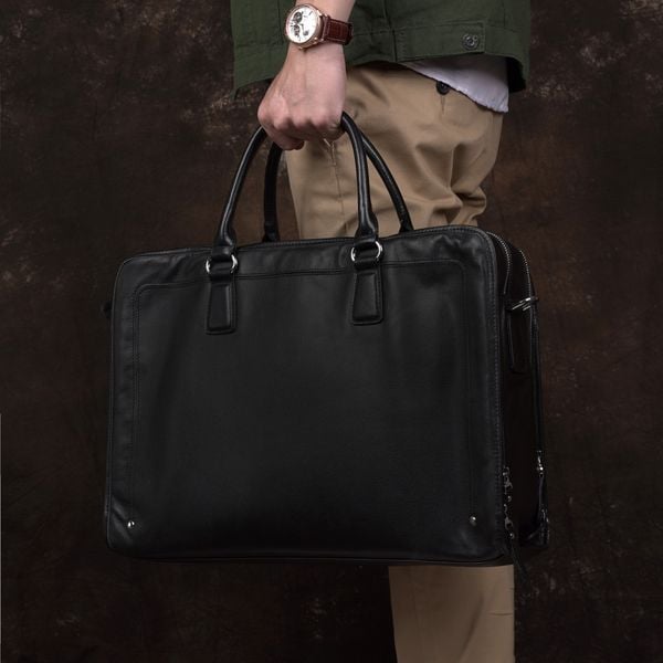 - Với thiết kế tổng thể đơn giản, loại bỏ những chi tiết thừa, bề mặt da láng mịn, màu đen sang trọng ấn tượng, tôn vinh được sự mạnh mẽ của nam giới giúp chiếc túi xách da này thêm phần cá tính và thu hút hơn.