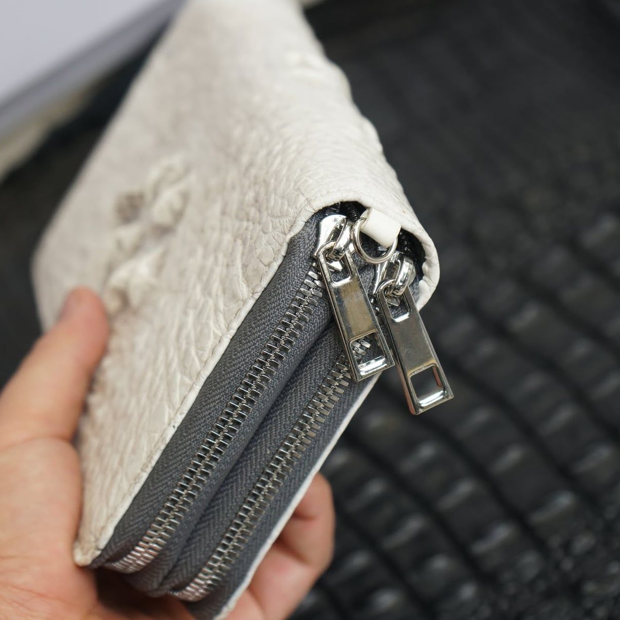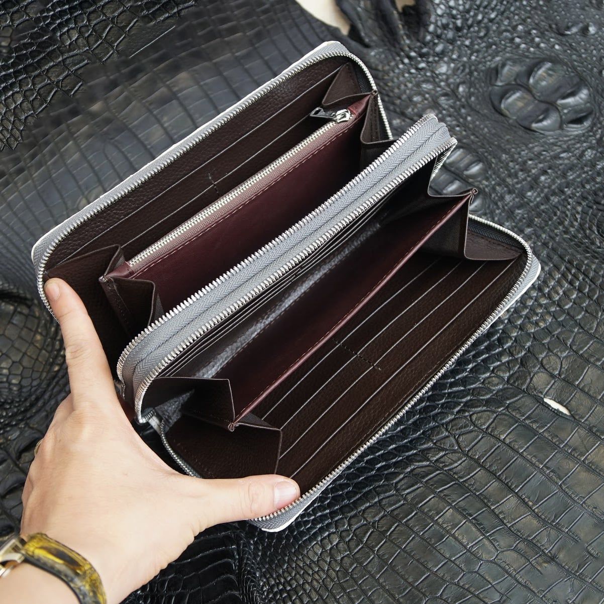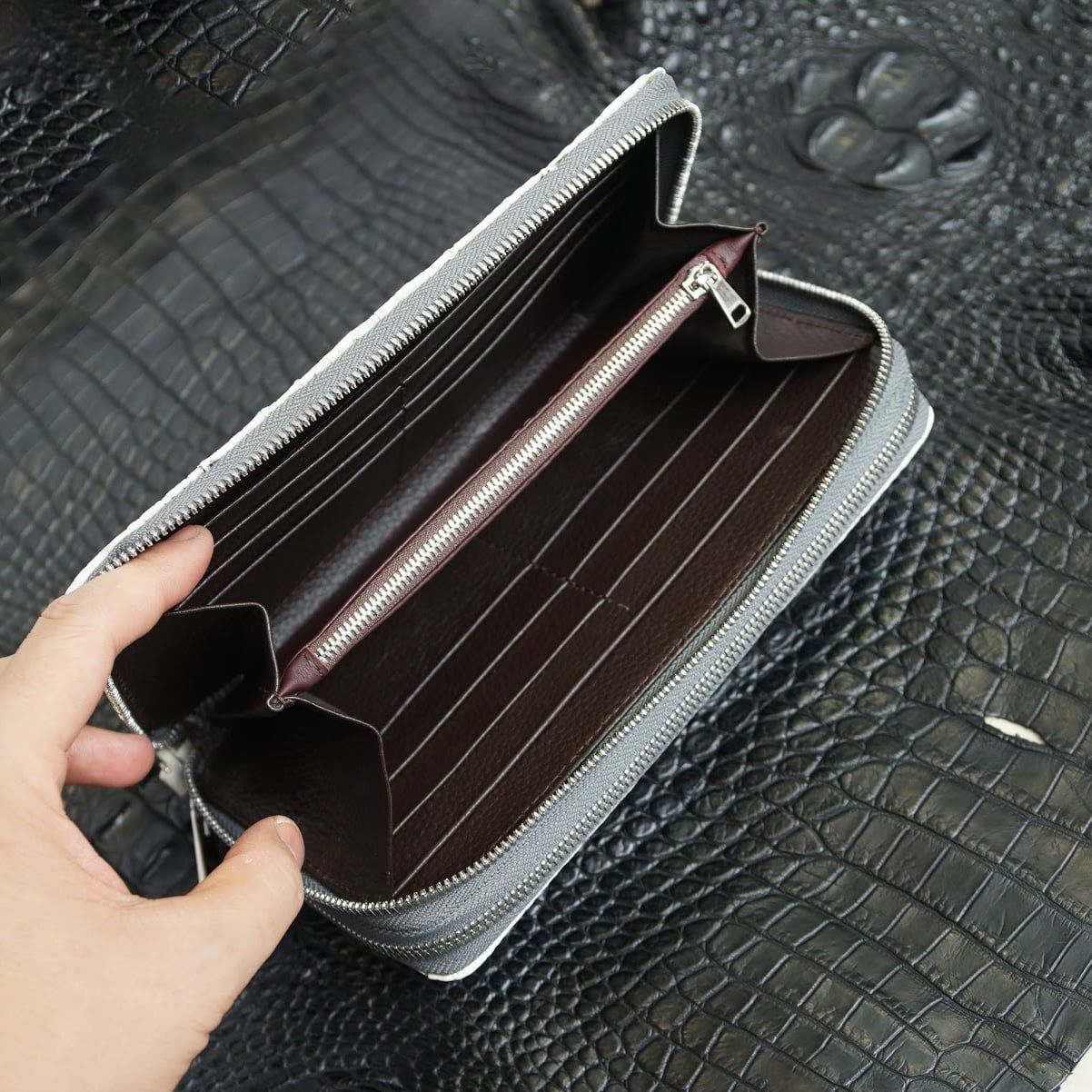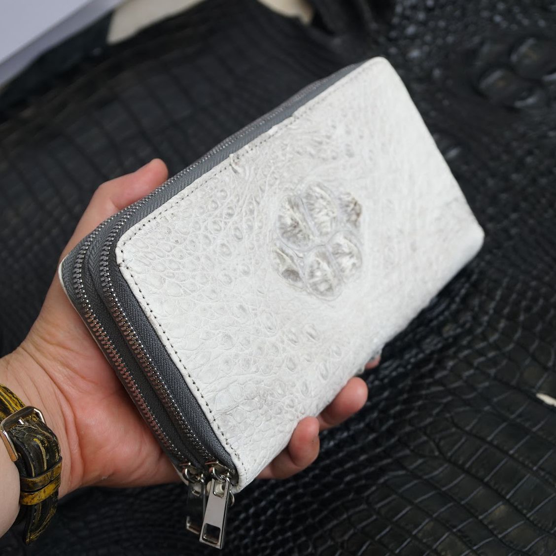 Ví cầm tay hai khóa gù lưng Cá Sấu cỡ đại - Bạch tạng