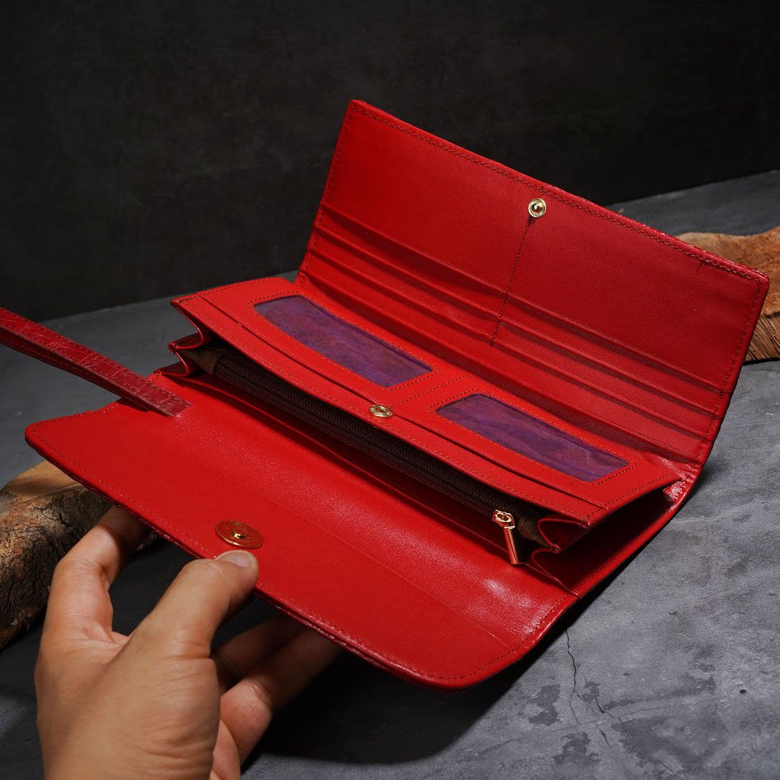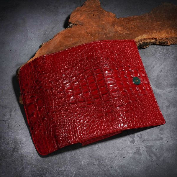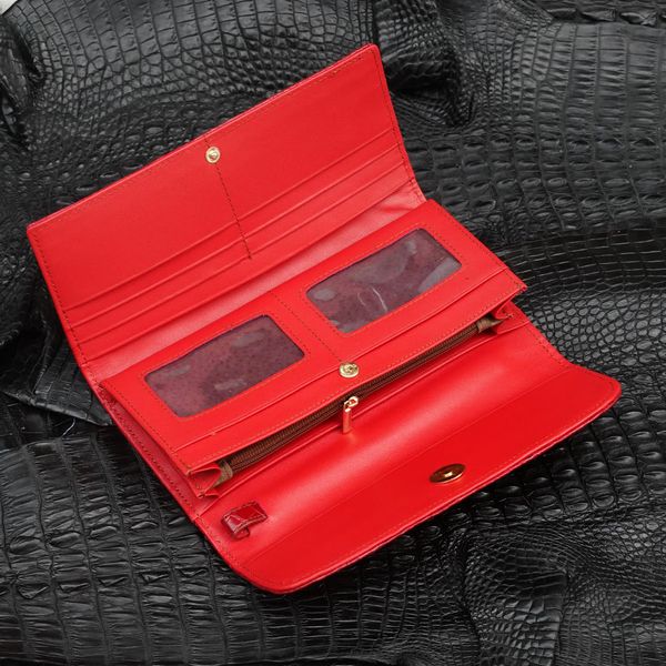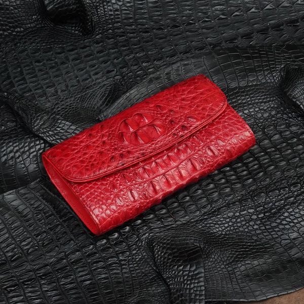 - Ví da Cá Sấu 3 gấp gai lưng - Đỏ tươi nguyên con được làm từ nguyên miếng da cá sấu con, đặc điểm nổi bật của ví loại này là có phần gù đầu 6 múi (hoặc 5 múi), ở phía trên và phần gai lưng chạy dọc và phân bố đều ở mặt sau của ví, khi trải dài chiêc ví ra thì ta nhìn thấy rõ miếng da nguyên con cá sấu nhỏ kéo dài từ đầu tới đuôi ở mặt ngoài của ví.