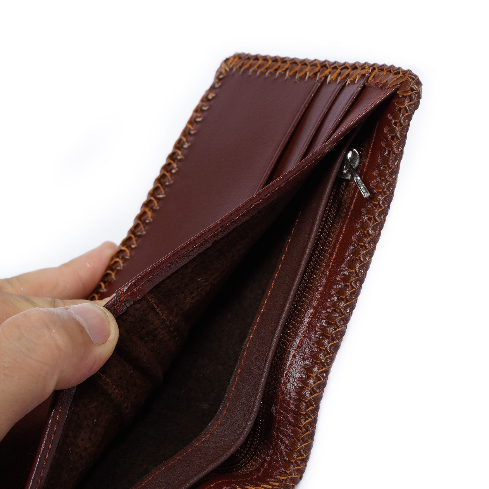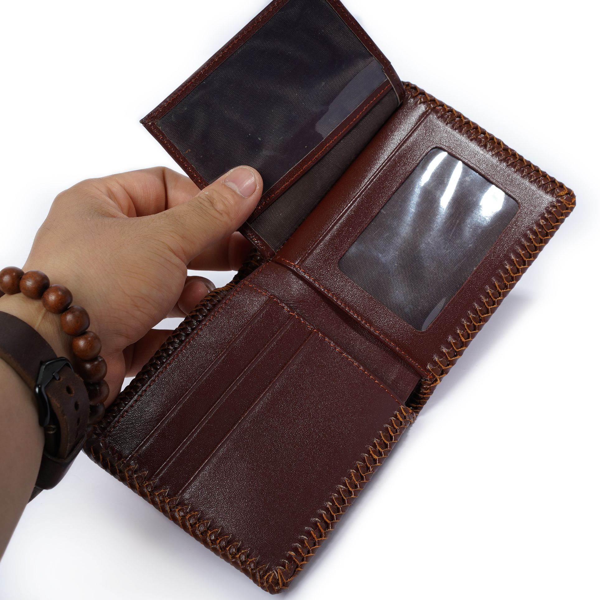 - Viền bóp ví da được gấp mép, ép với da bò may viền lại tạo sự chắc chắn, bền hơn, đẹp hơn nhiều.